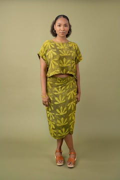 Woman holding shell wearing matching crop wrap top and wrap skirt by Geometric green tone hand dyed deadstock fabric.