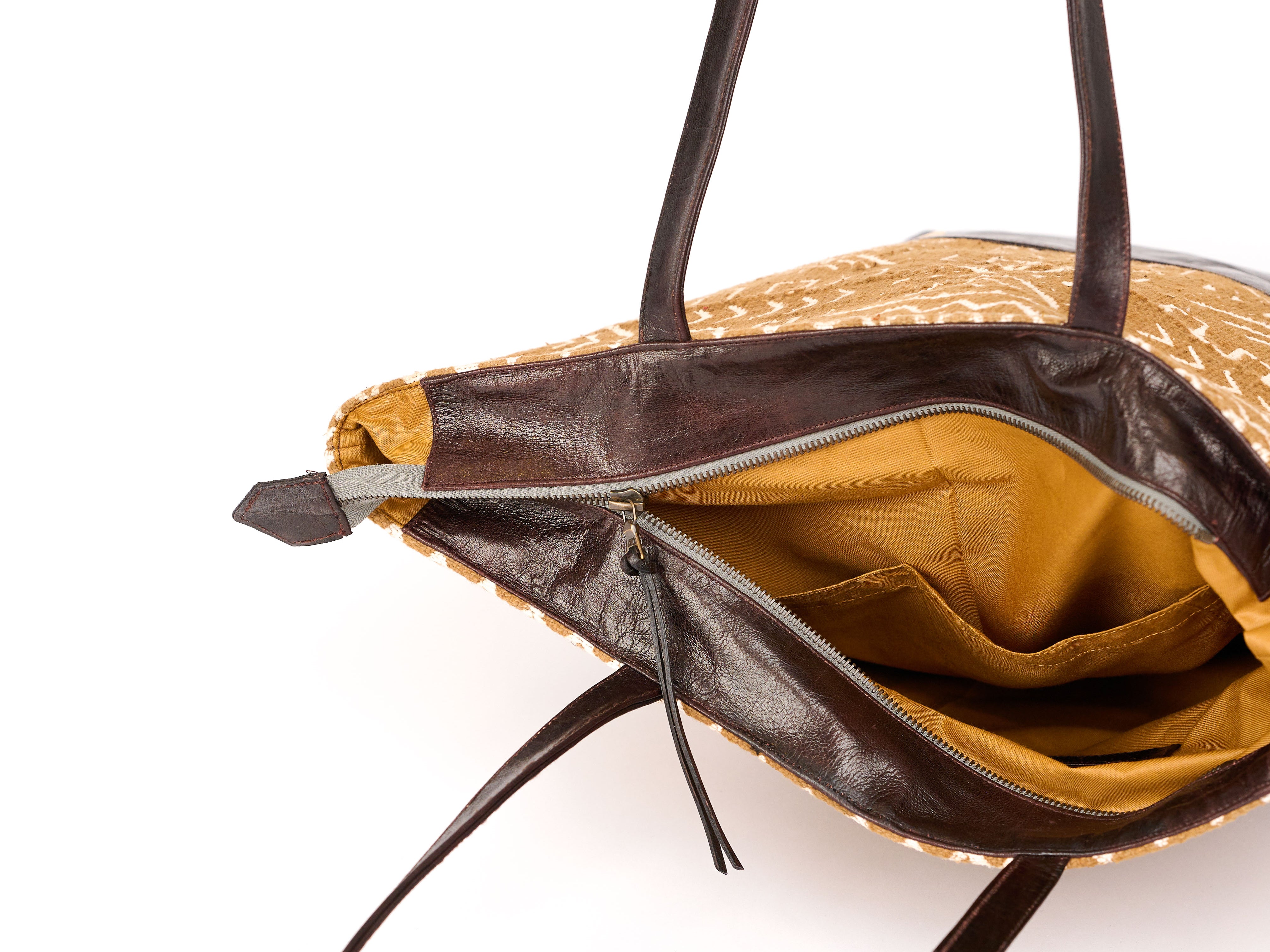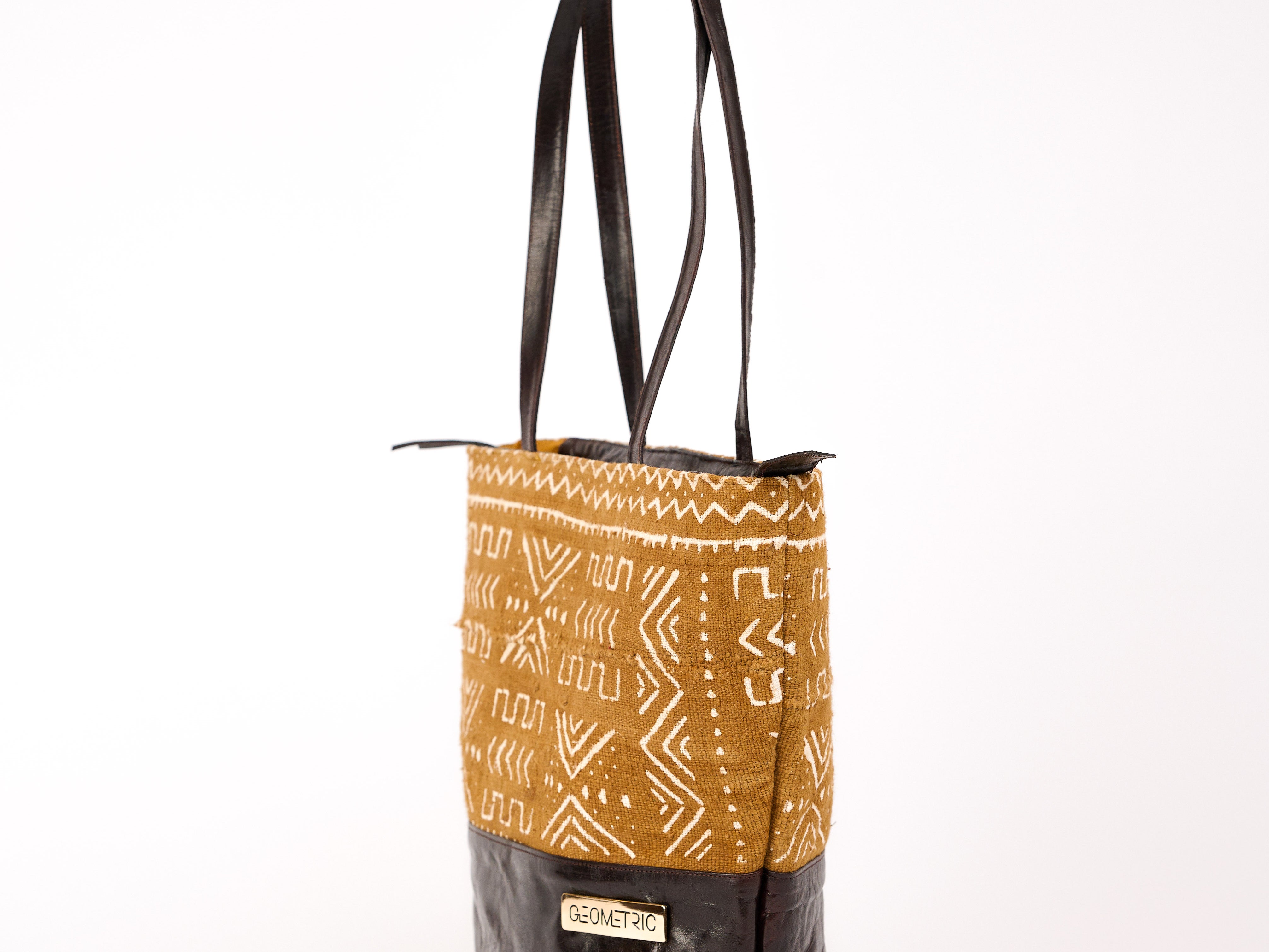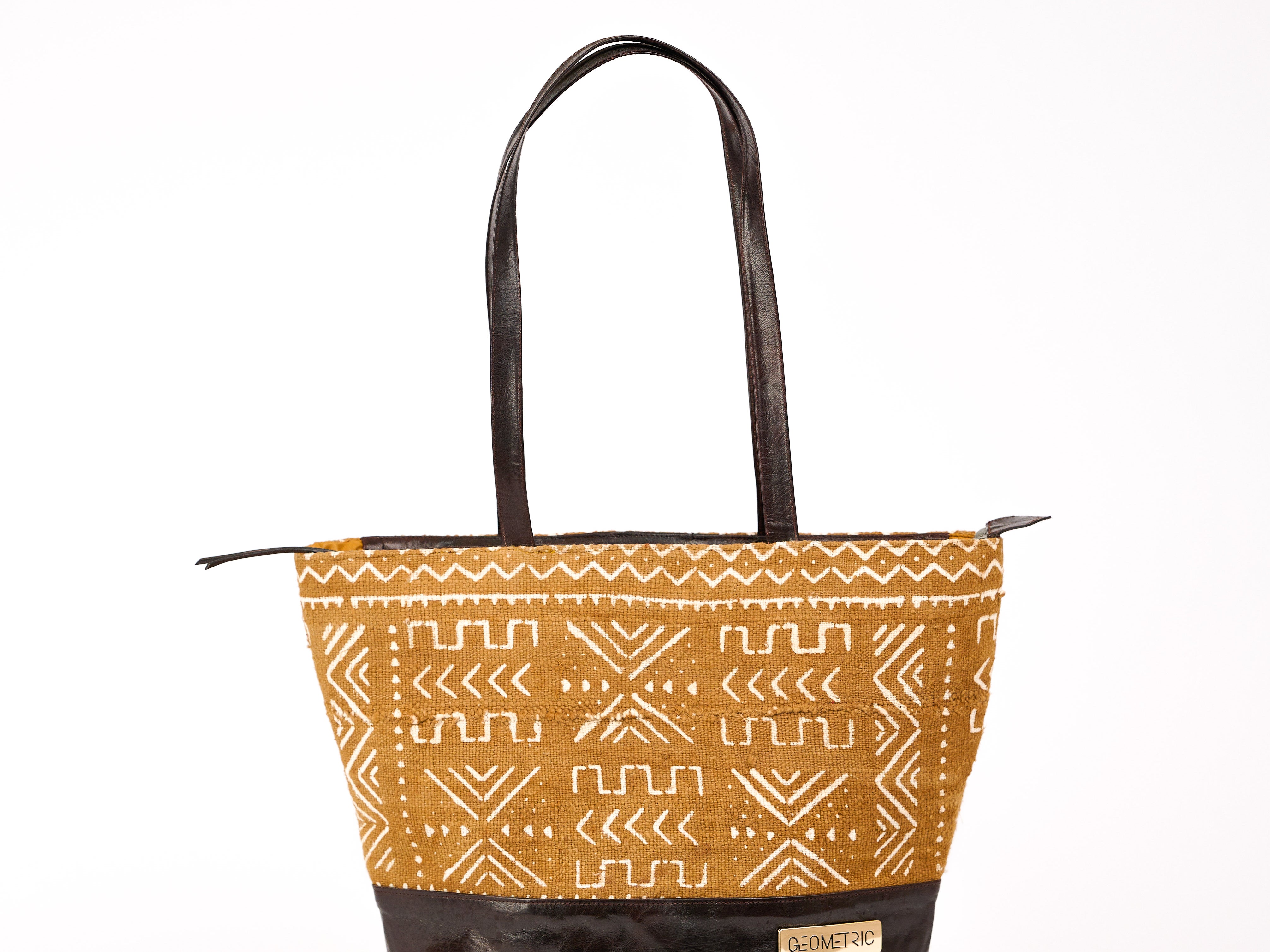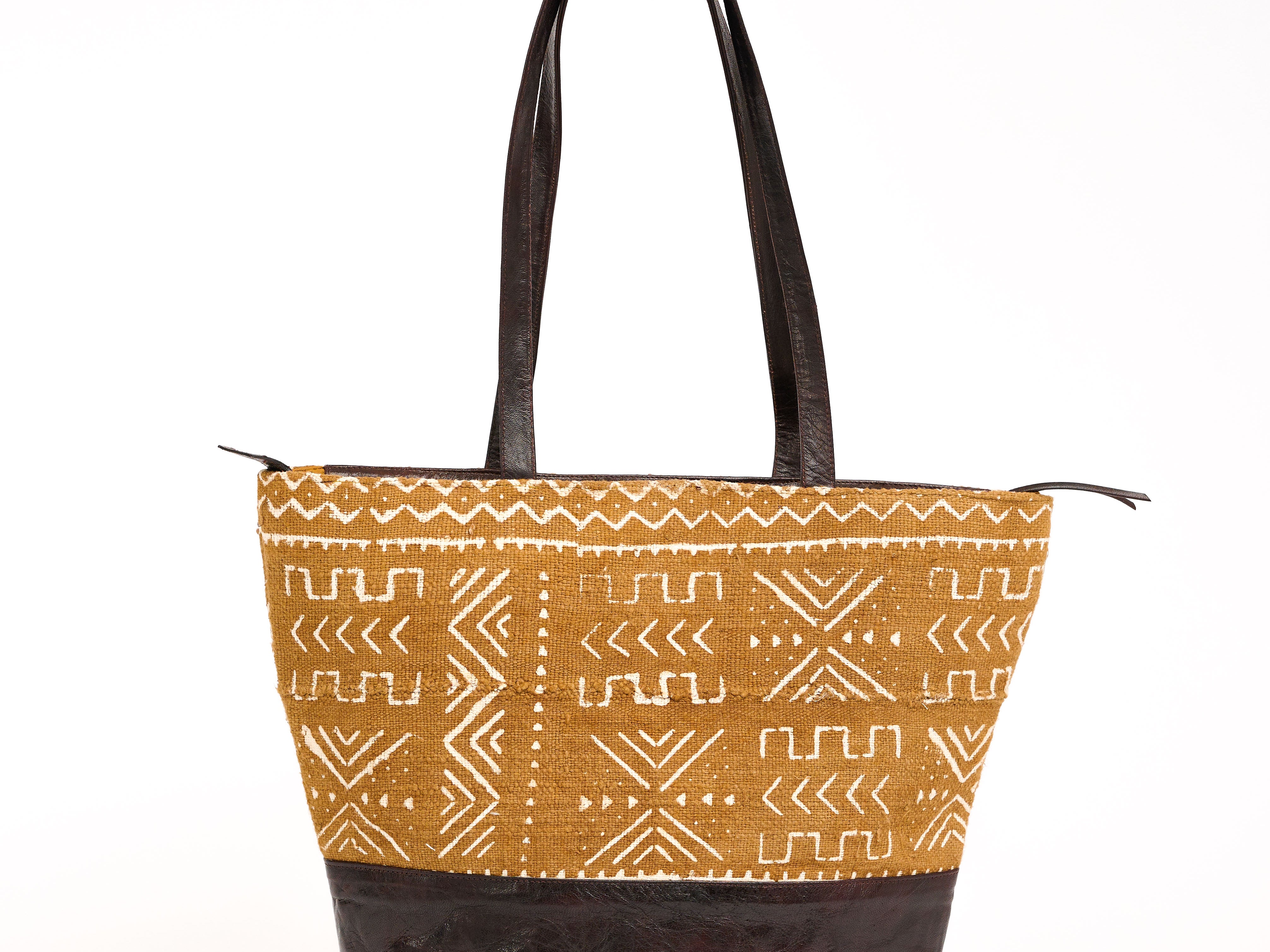 The Mudcloth & Leather Tote Bag is large enough to pack for a weekend getaway or your morning commute. Zip everything up and get on the road! These handwoven textiles are made with traditional Mudcloth dyeing & hand-painting techniques. We source these textiles from artisans in Mali and Northern Ghana. Our Geometric Tote collection is made using superior materials and refined leather processing methods.