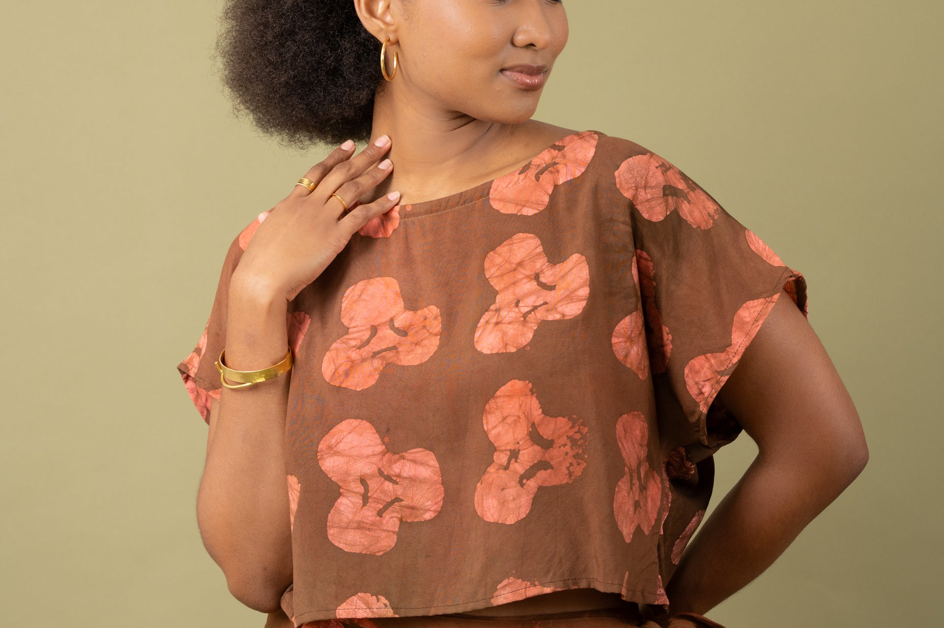 Discover the Ackee Crop Top, with its eye-catching cut-out back and flowing kimono sleeves, this top shifts from a sophisticated back feature to a daring front cut-out, thanks to its reversible design. Made from sustainably sourced deadstock rayon, each piece is hand-dyed and sewn in Jamaica, embodying the island's essence in our limited edition range.