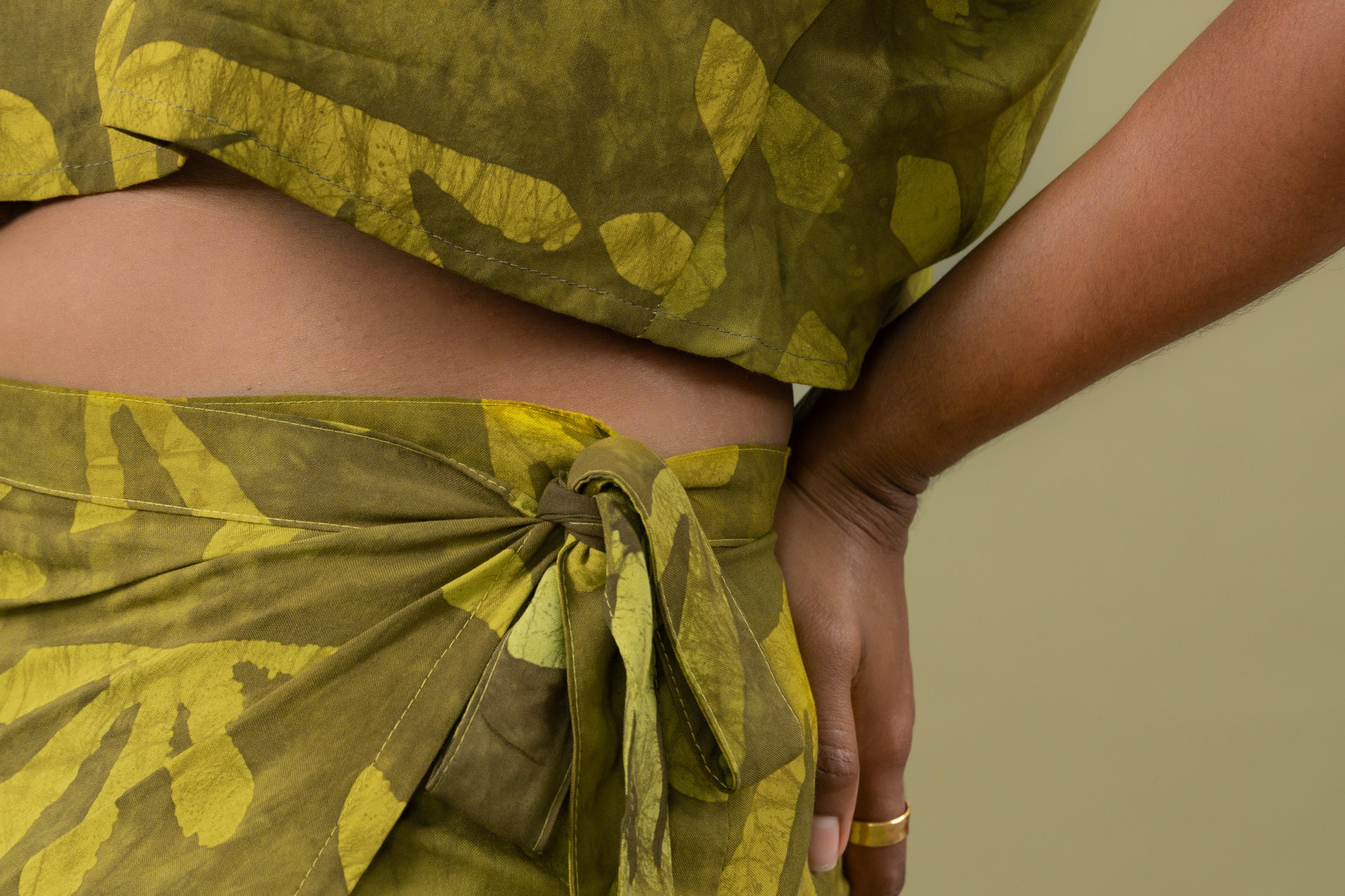 The Sunshine Crop Top – A statement piece that seamlessly combines style with versatility. Its cut-out back and breezy kimono sleeves make it a standout addition to any wardrobe. Try wearing the cut-out facing front for a bold twist. Created from sustainably sourced deadstock rayon, each top is carefully hand-dyed and sewn in Jamaica, embodying the lively soul of the island in every stitch.