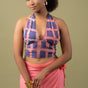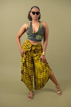 Woman wearing yellow hand-dyed batik print Halter Top by Geometric.