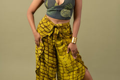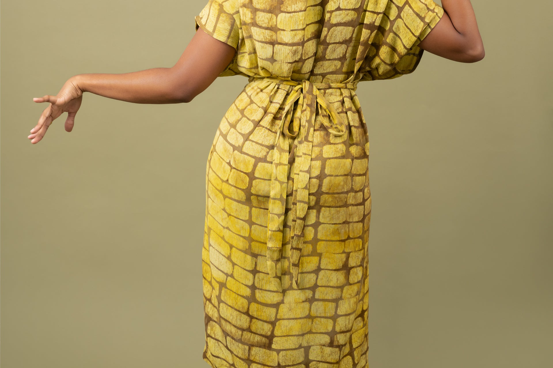 Crafted from sustainably sourced deadstock rayon, each top is meticulously hand-dyed and sewn in Jamaica, embodying the lively spirit of the island in every stitch. Our Techno print is inspired by the intricate cut-stone patterns of Jamaican architecture and infused with the brightest chartreuse reminiscent of modern technology.